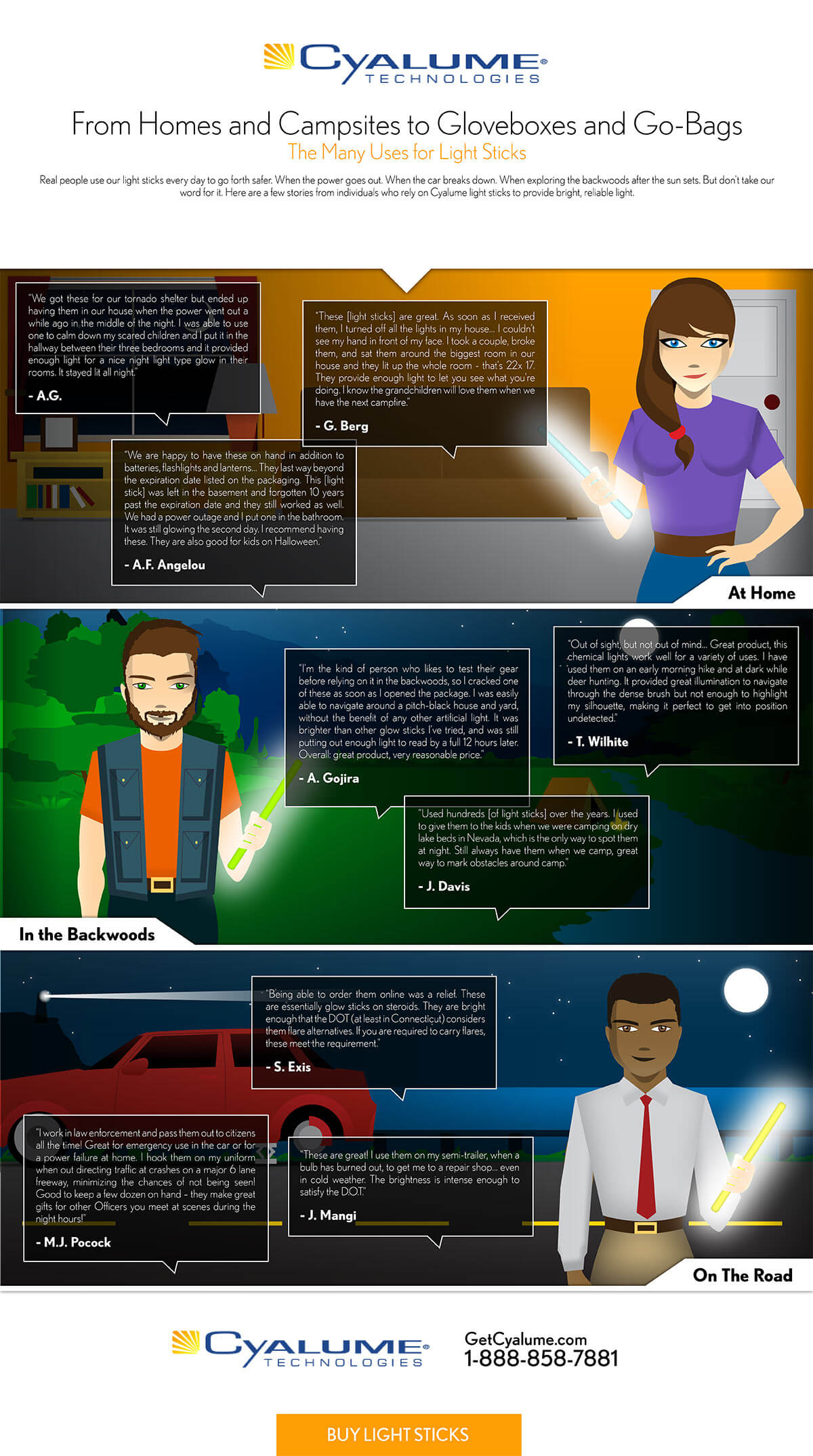 To showcase just how versatile and trusted Cyalume light sticks are, we thought we would put together a collection of customers who shared how and why they use our sticks. At home, at the campsite and on the roadside, these customers know: there’s no emergency light more reliable than Cyalume.